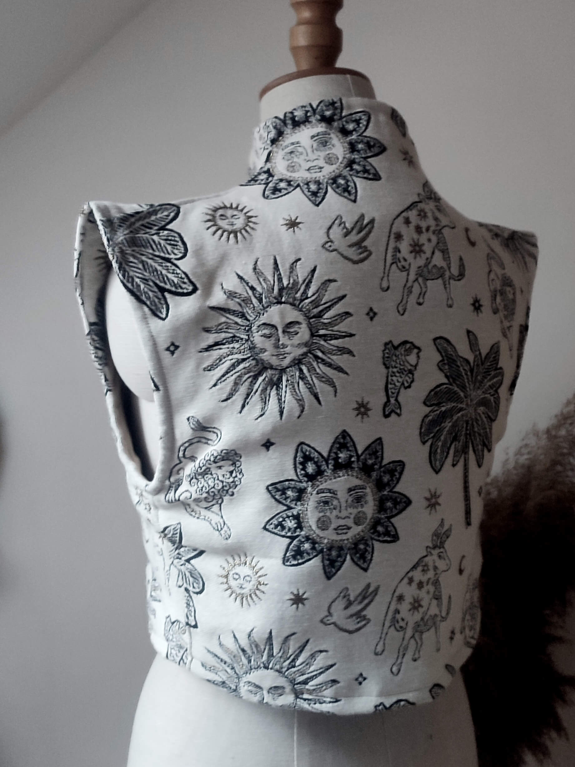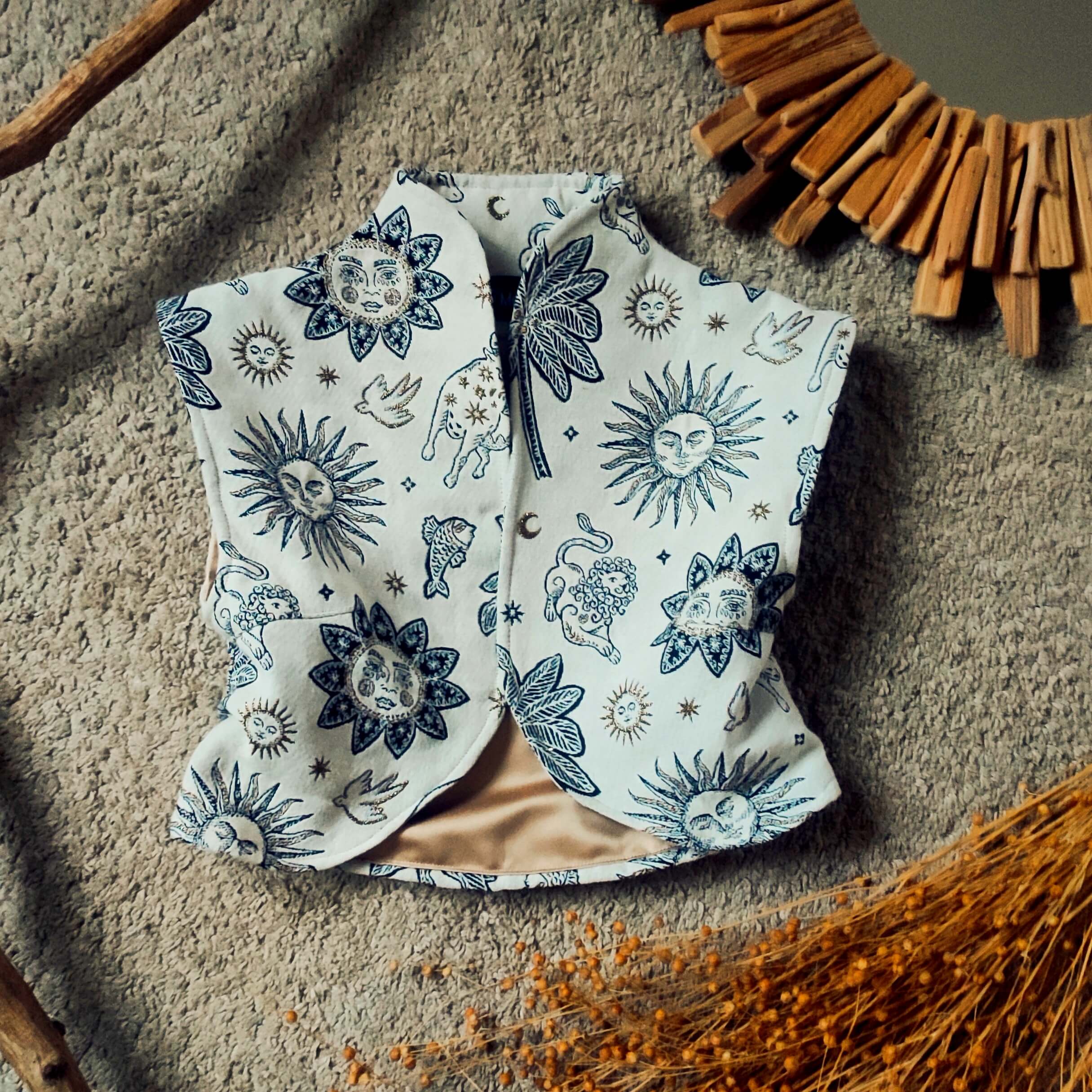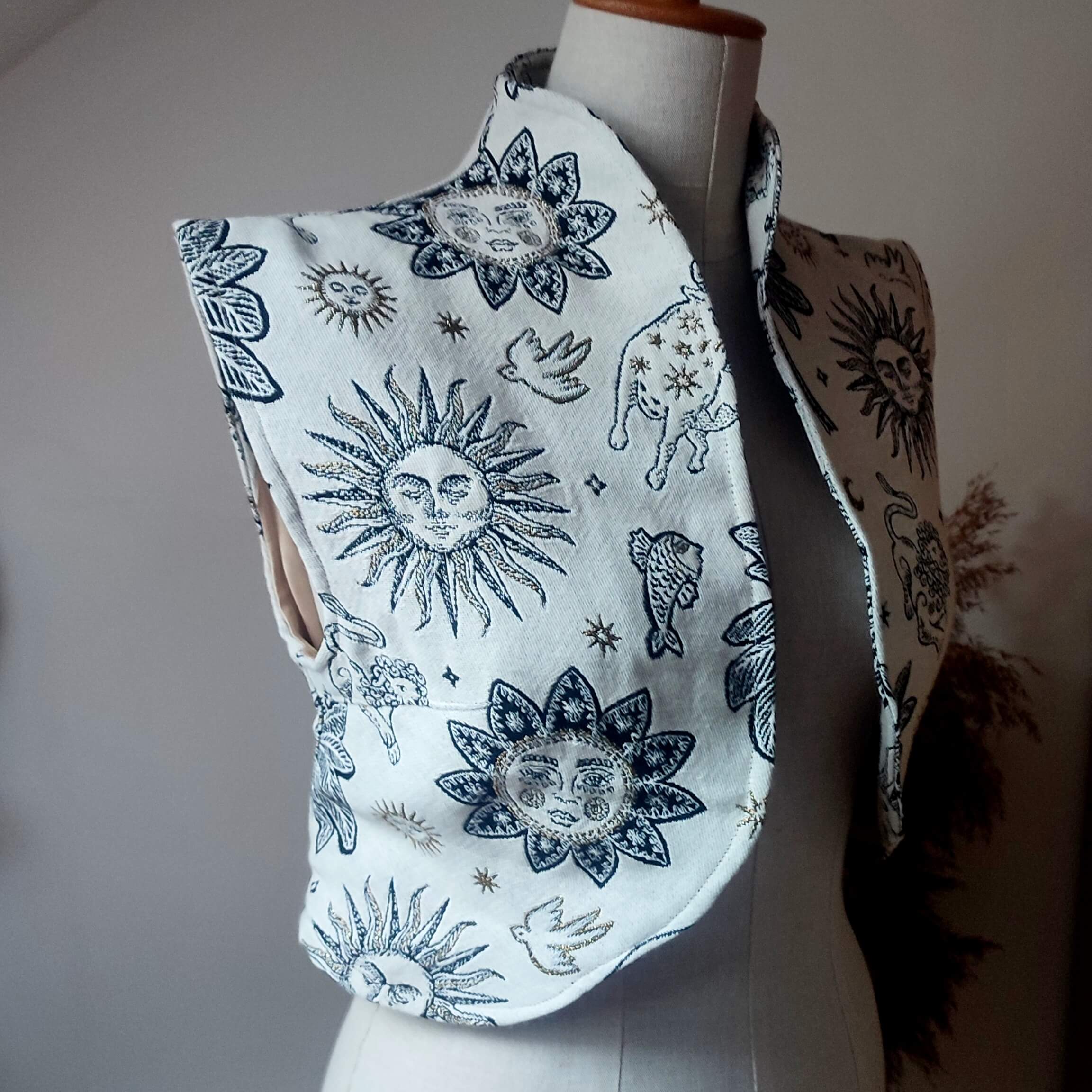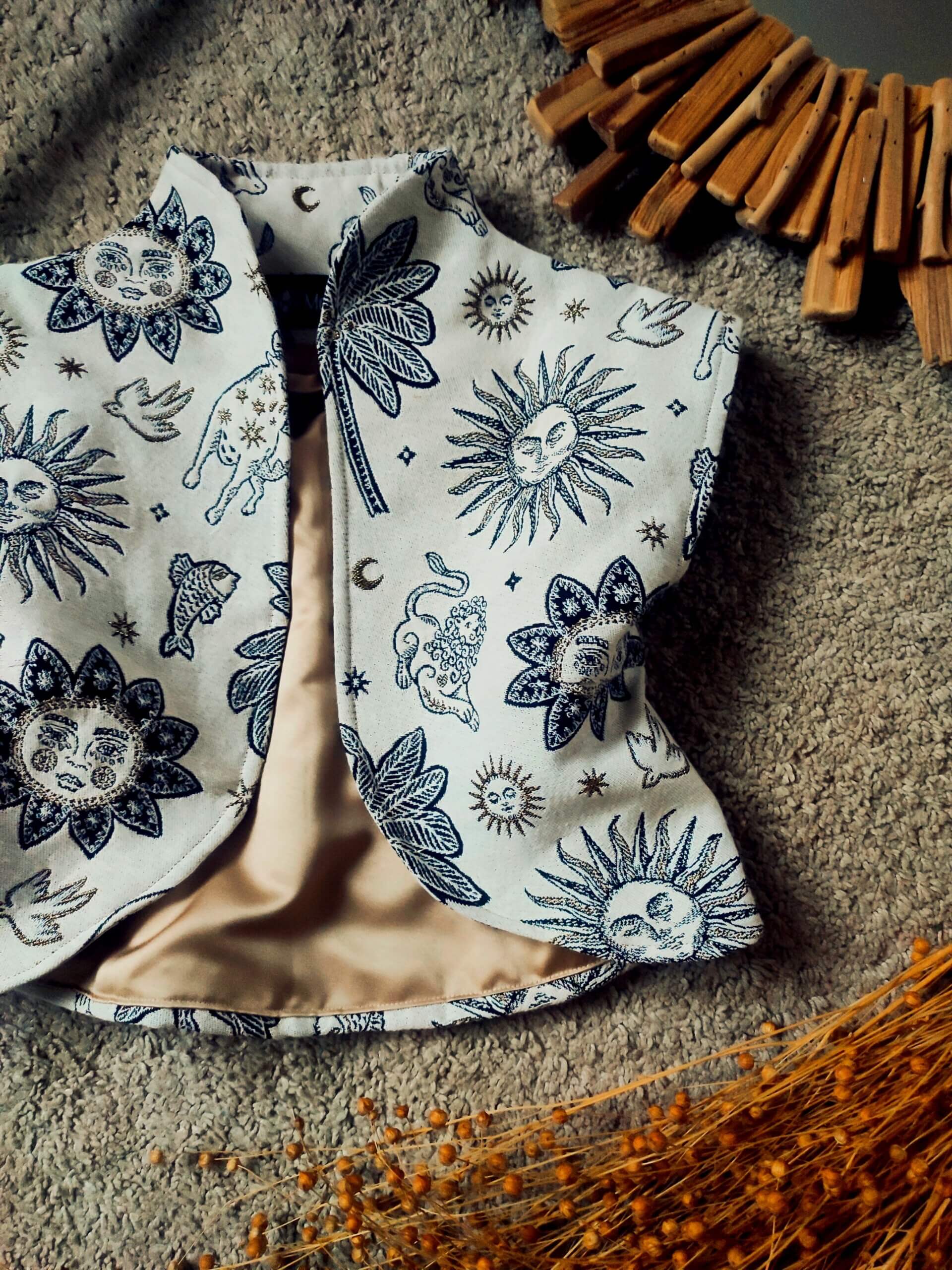 Zvýrazněná linie ramen bolera přechází do elegantního stojáčku, a spolu se saténovou, podšívkou je kouskem, který zaručuje luxusní pocit a vzhled. Je zosobněním jedinečnosti s gobelínově vytkávaným vzorem nebeských znamení.