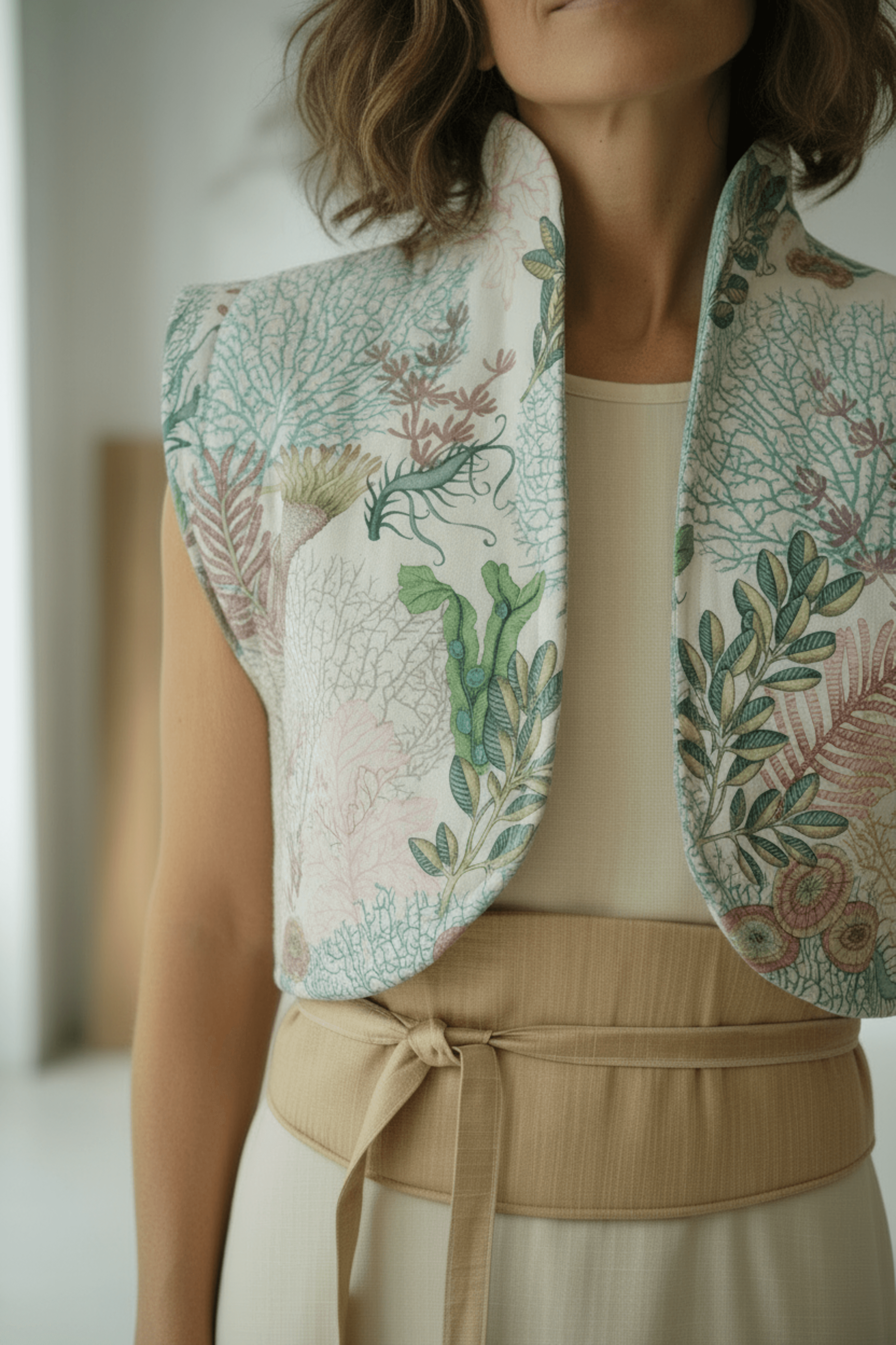 Motivy podmořského světa korálů a řas v něžných pastelových barvách krásně pozvednou a doplní společenský jednobarevný outfit především v růžových, zelenomodrých , zlatých a bílých tónů. Krátké sáčko bez rukávů, nebo-li Bolero je elegantním doplňkem především šatů, topů a overalů.