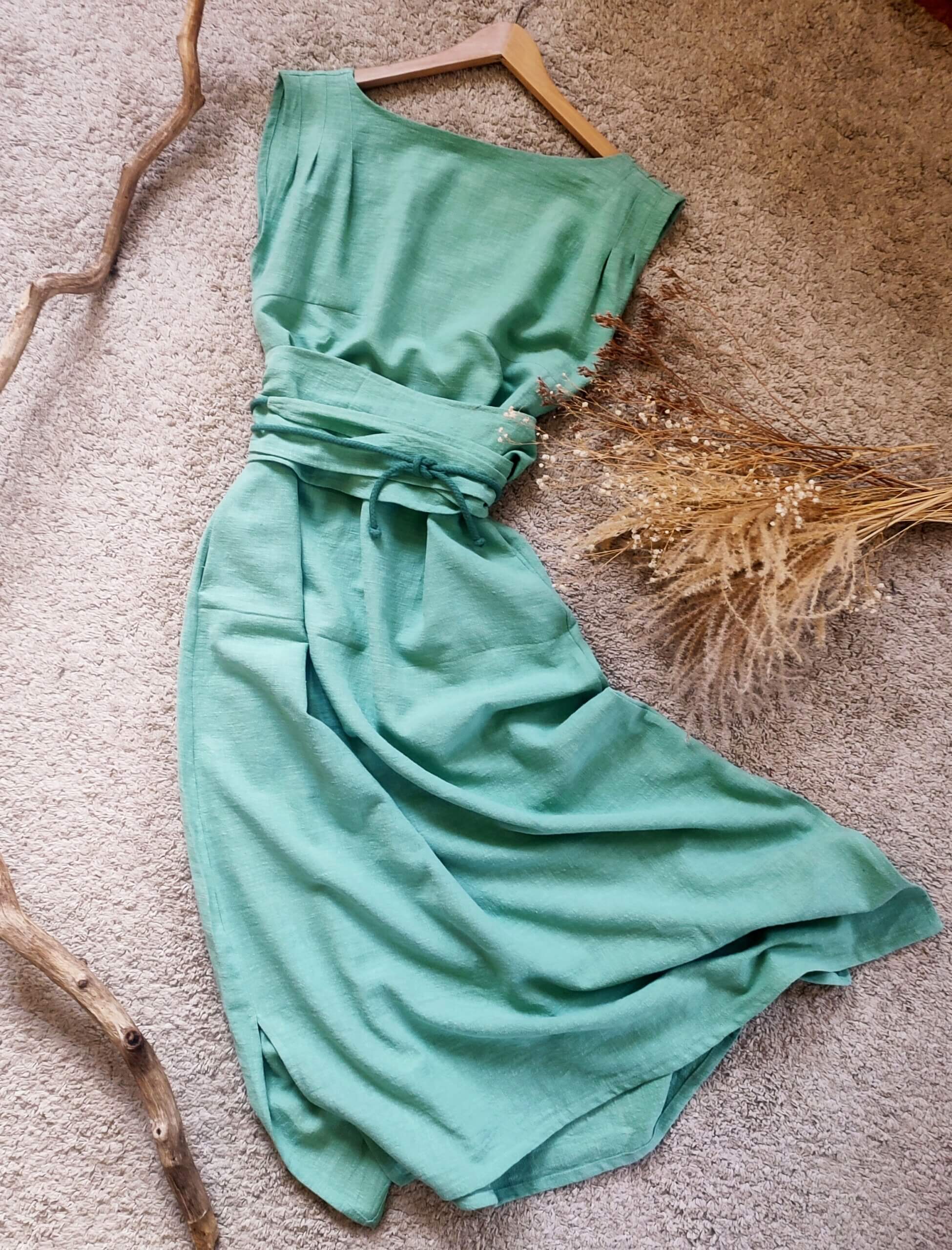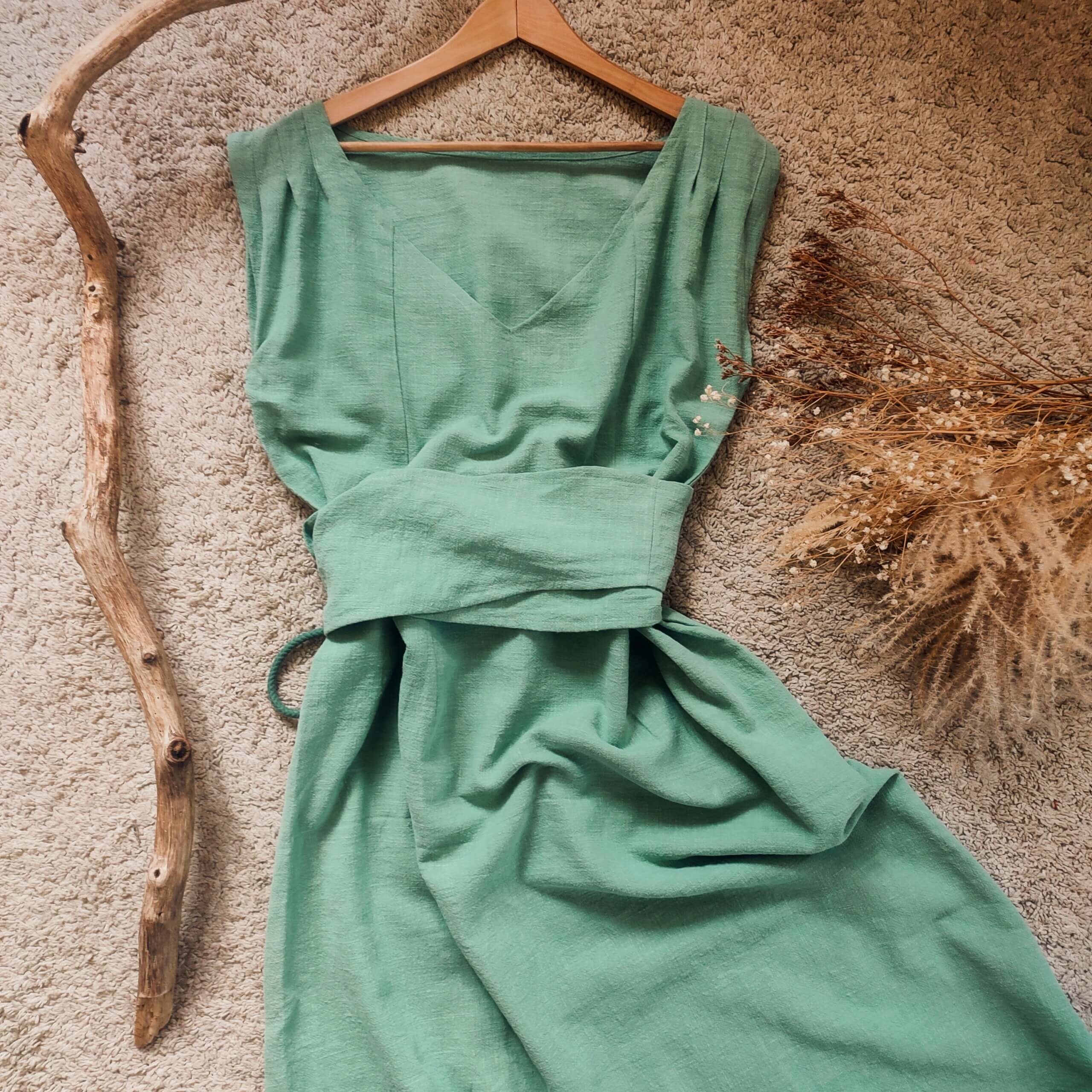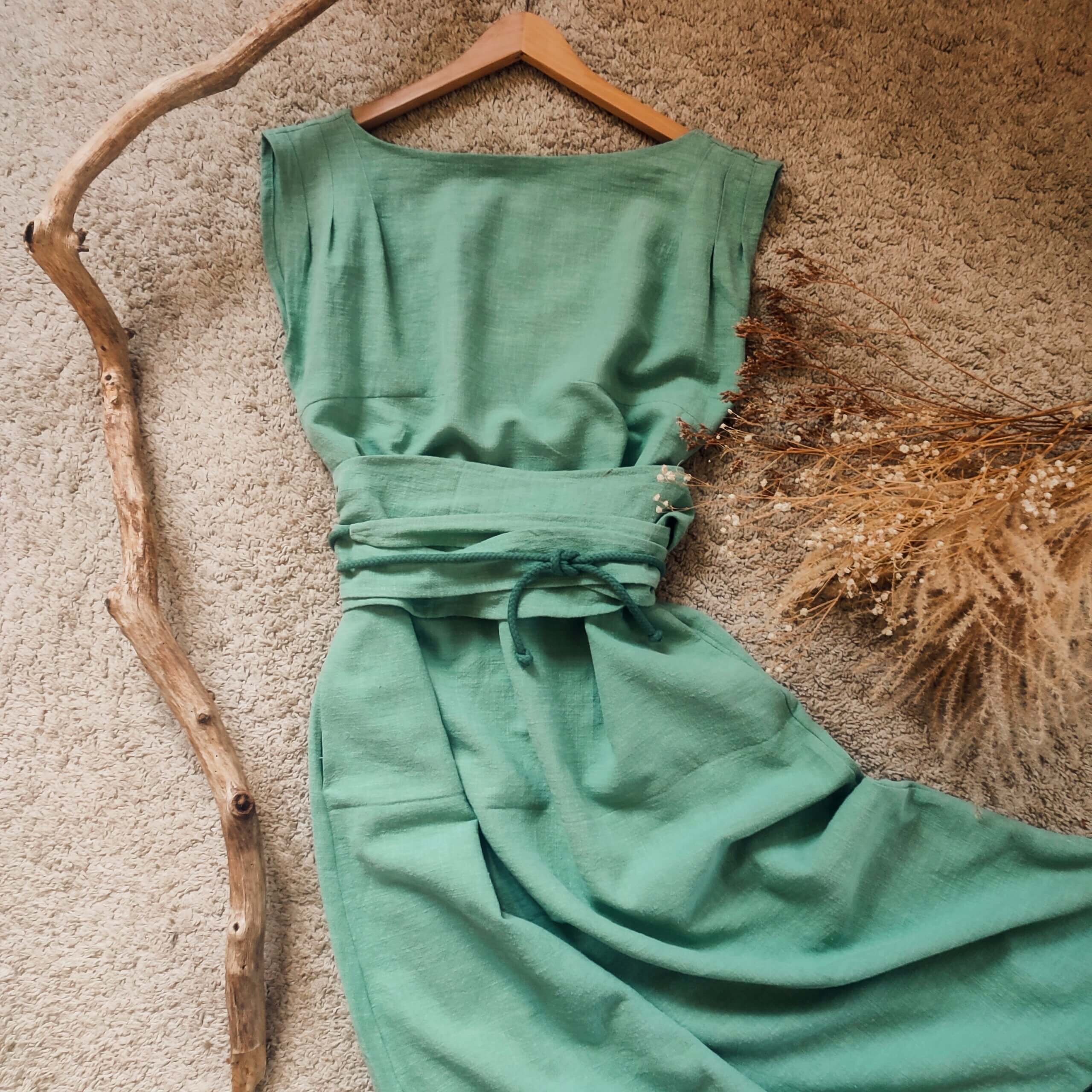 Dlouhé šaty v áčkové siluetě jsou elegantním kouskem nositelným díky vyštíhlení siluety zadního dílu jak na volno bez pásku, tak s ním. Mají kapsy v bočních švech a rozparky pro co nejsvobodnější pohyb. Véčkový výstřih na zádech pro oblažení v horkých dnech.