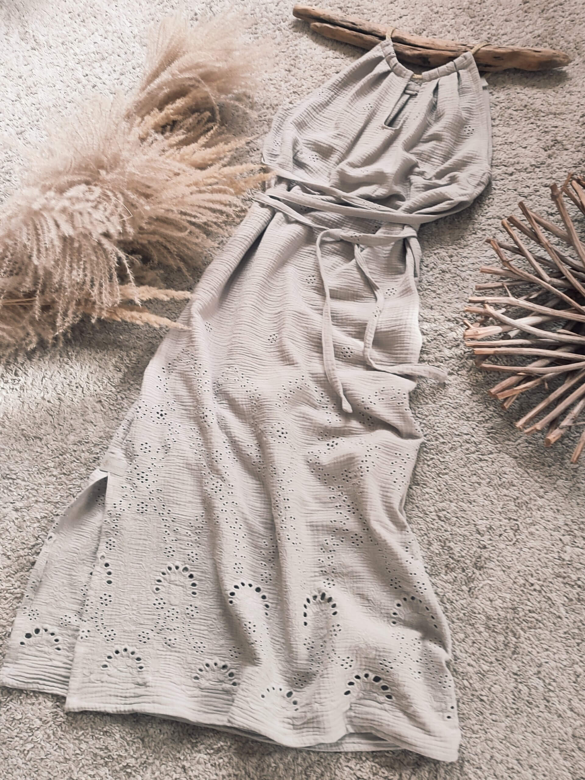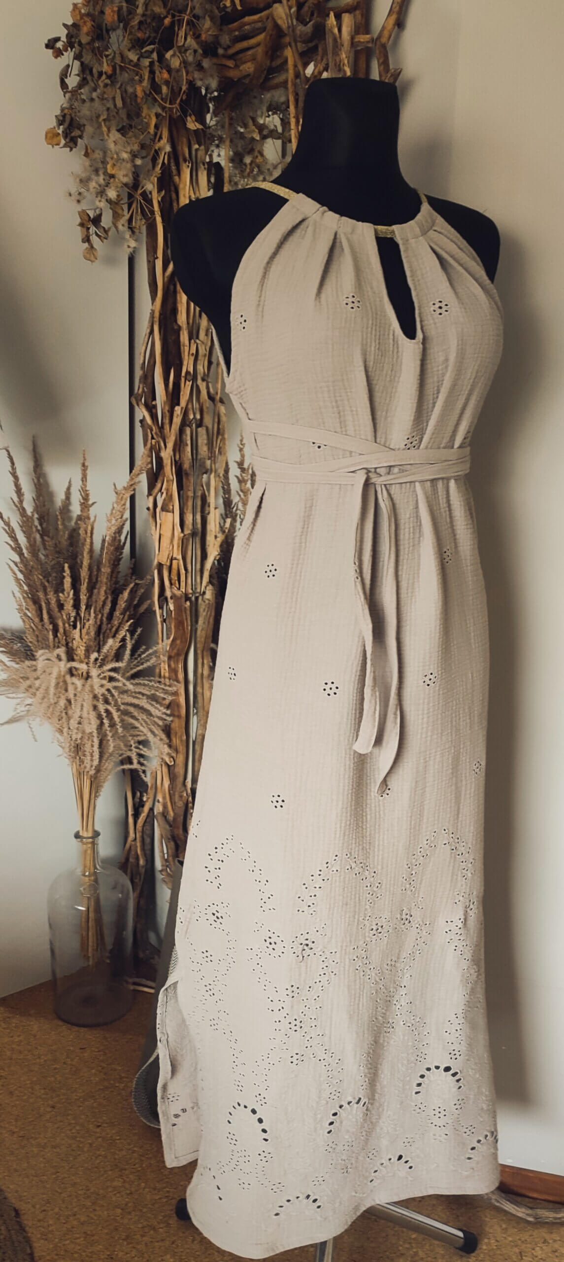 Mušelínové šaty z vyšívané bavlny v krémovém odstínu bílé kávy nebo mořského písku jsou zosobněním svobody, lehkosti a vzdušnosti.