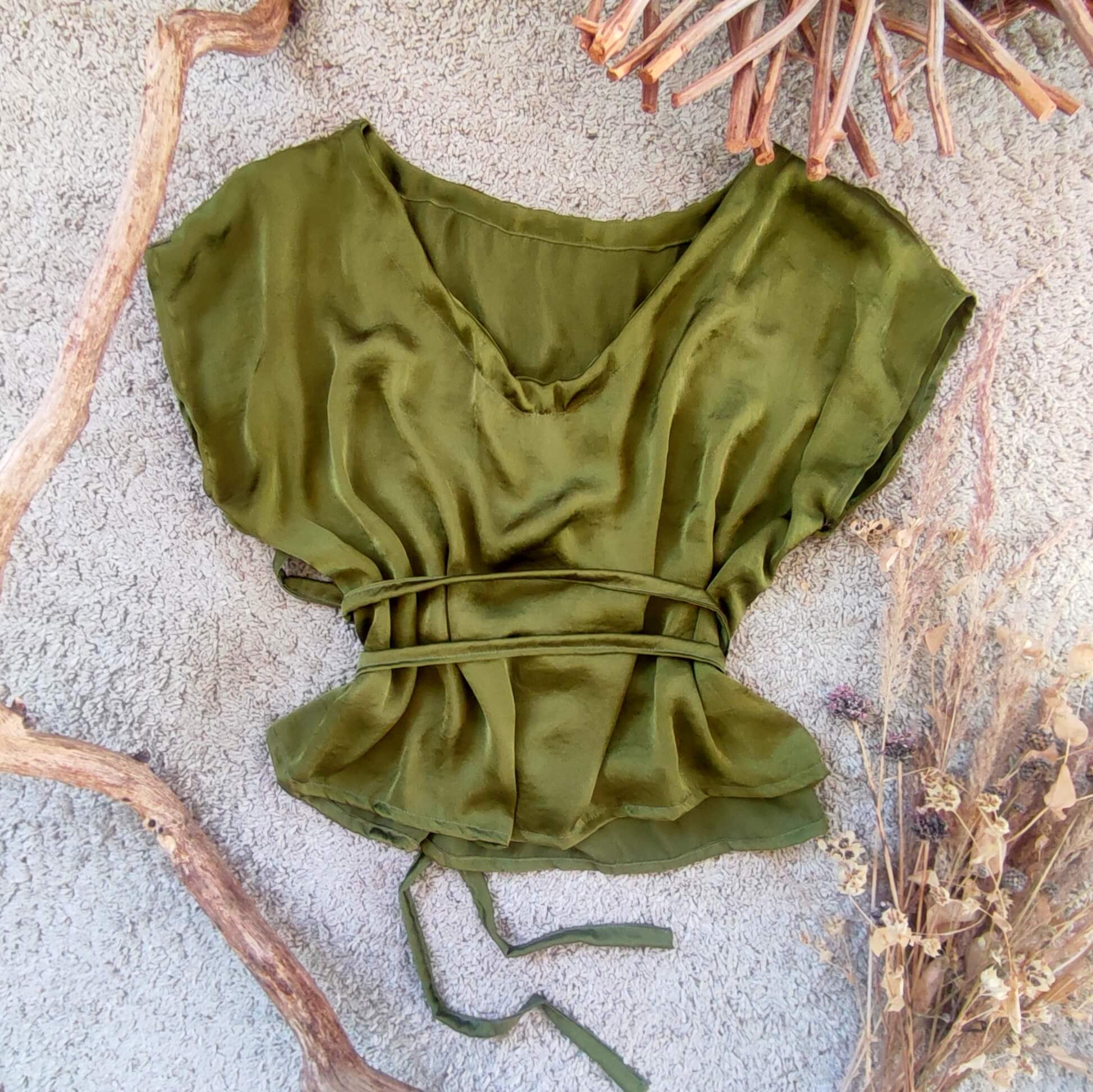 Dokonalá lehkost, jemná struktura a prodyšnost – top z umělého hedvabí v mechově zeleném odstínu je příjemný, lesklý a splývavý kousek, který je vhodný jak na každodenní nošení, tak i slavnostní příležitosti.