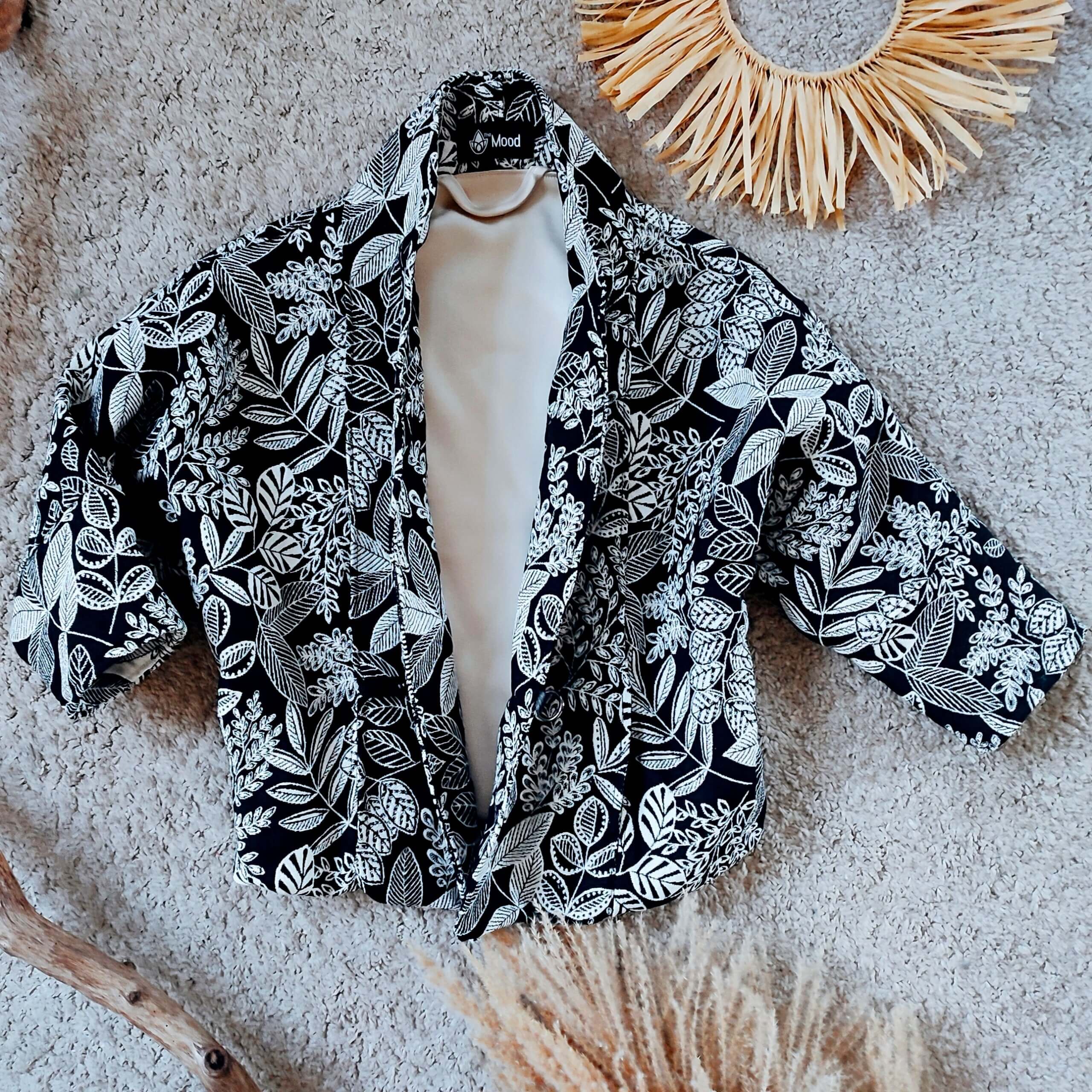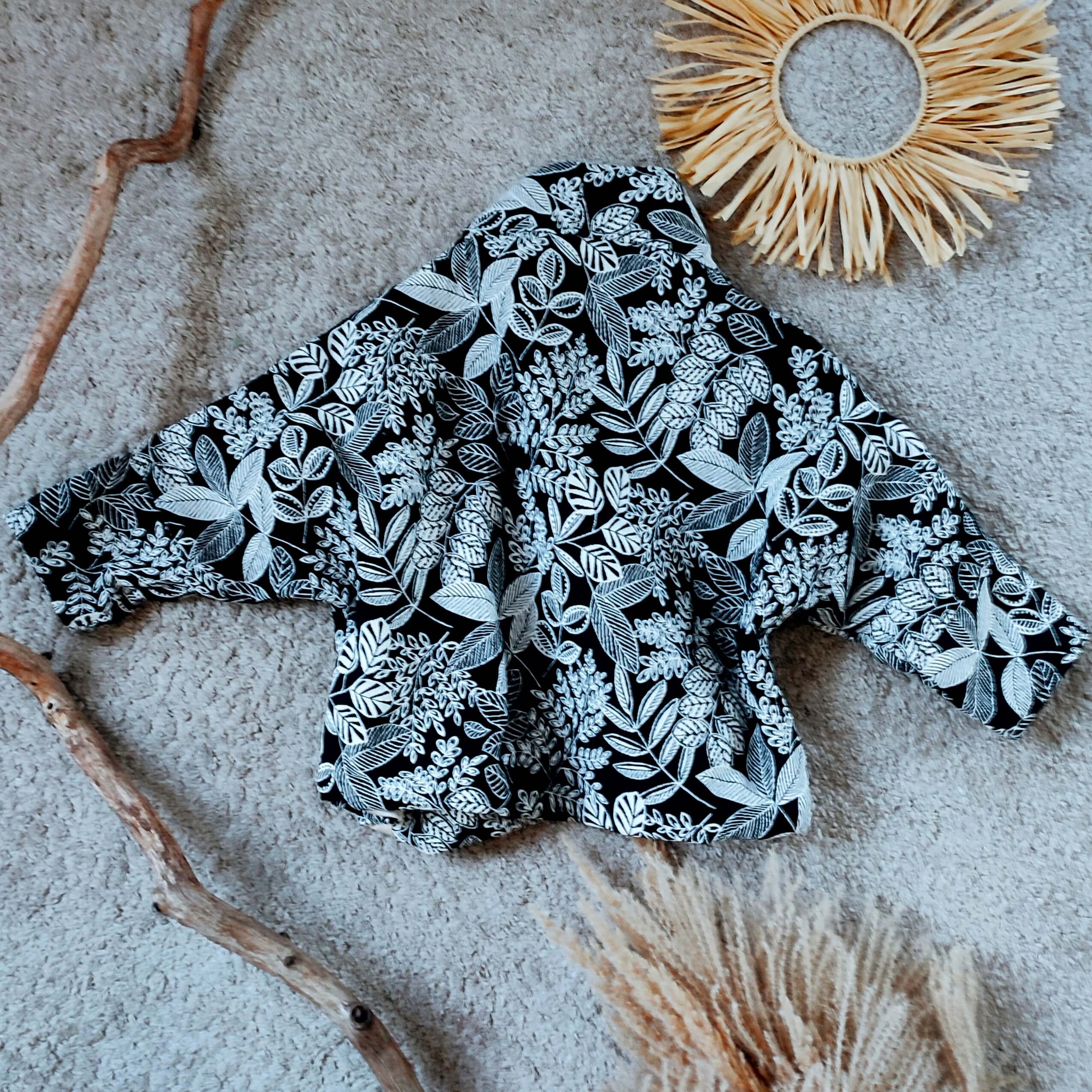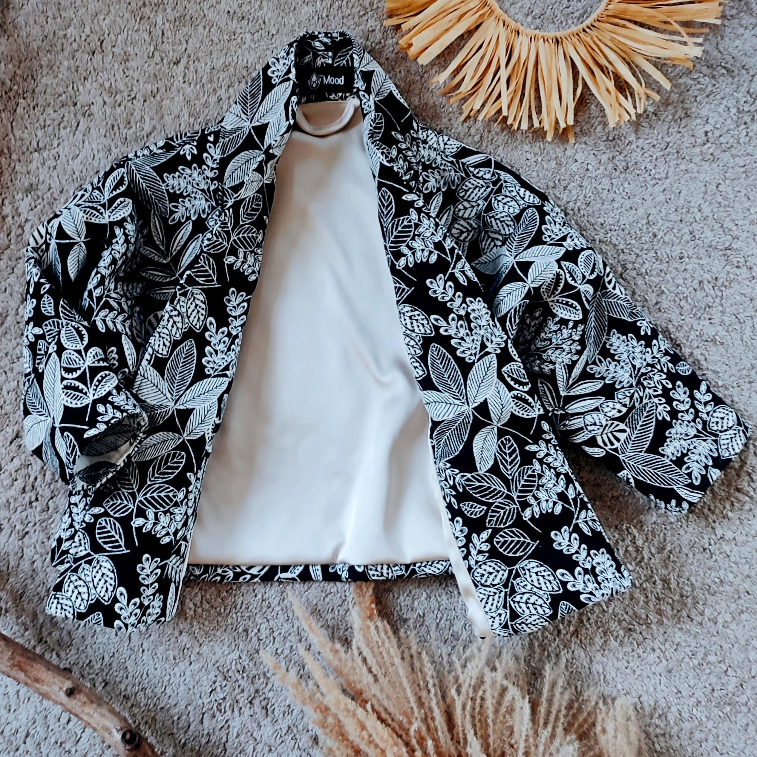 Kabátek s 3/4 rukávy je podšit saténovou podšívkou, kapsy jsou vypracovány pod širokým šálovým límcem. Lze jej zapnout na přezku z ekokůže.
