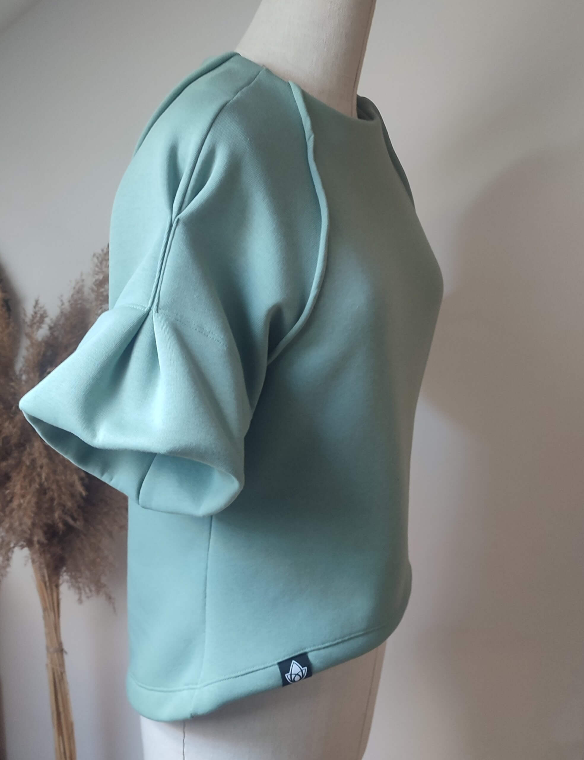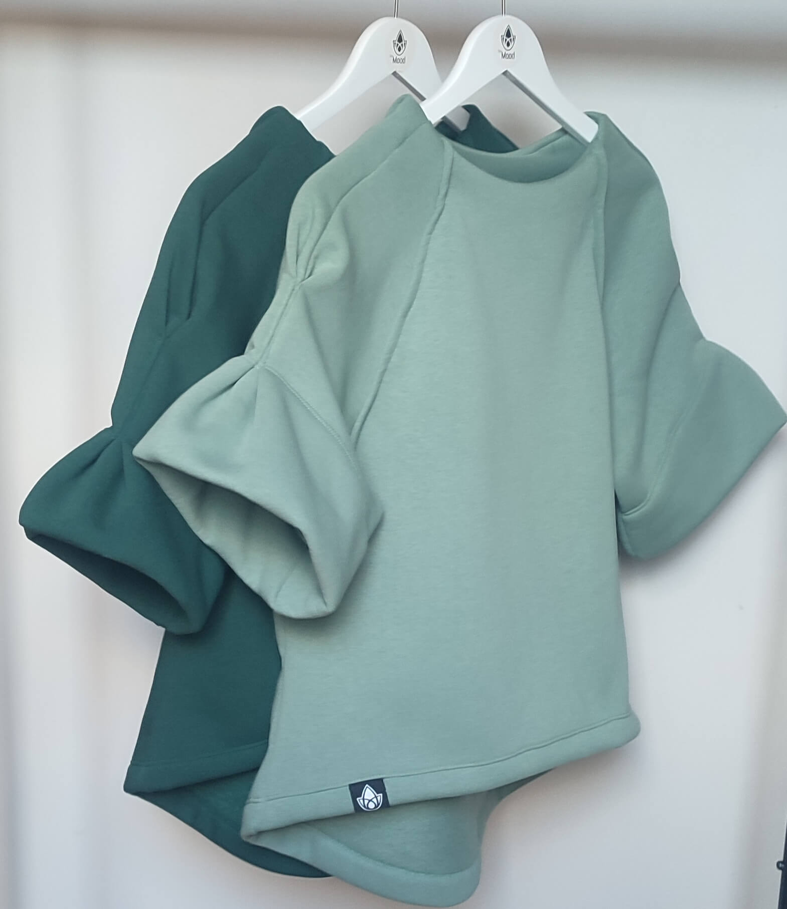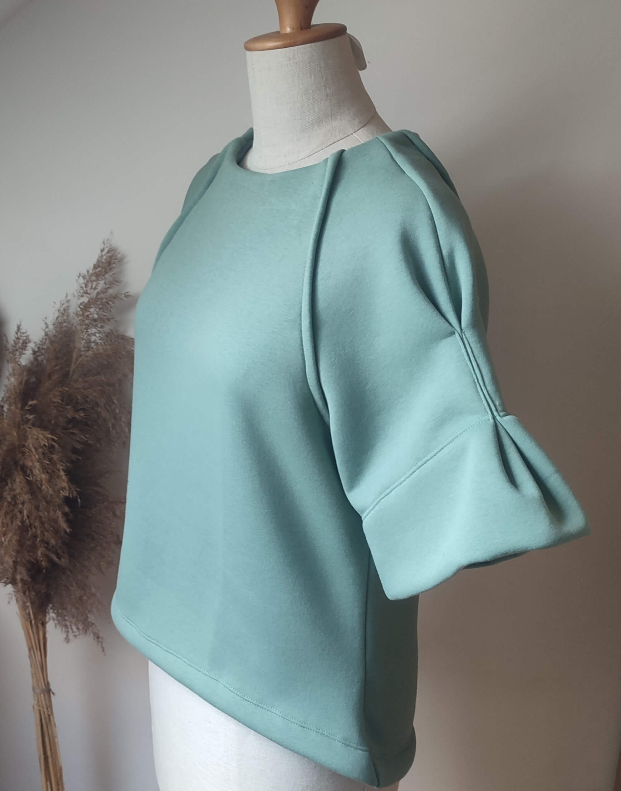 Asymetricky vykrojená mikina v modrozeleném odstínu, s raglánovými rukávy s délkou pod lokty vypadá skvěle v kombinaci s kalhotami, s přiléhavou sukní i jako druhá vrstva na úzké šaty.