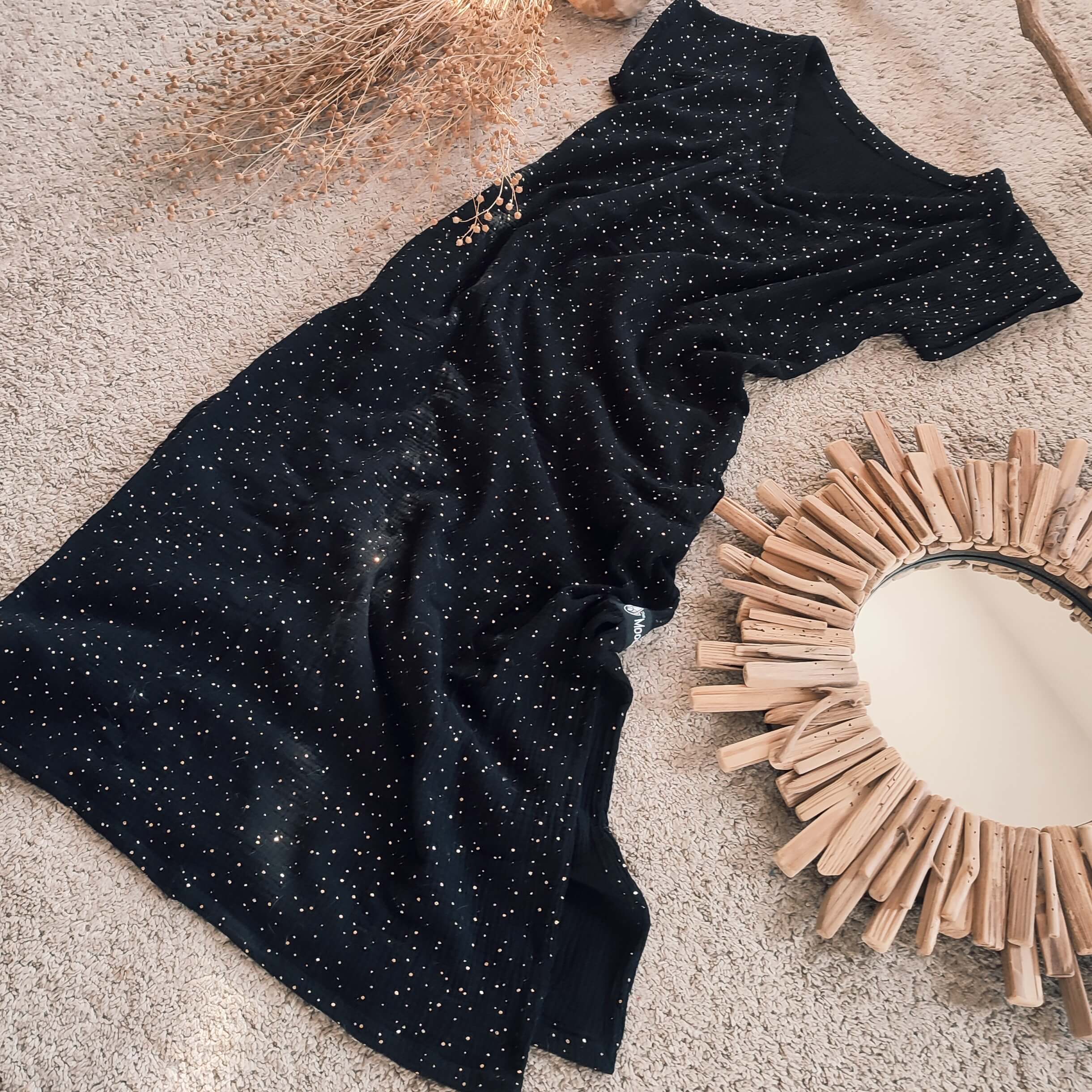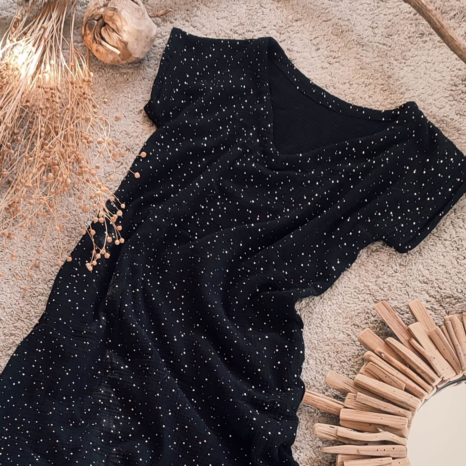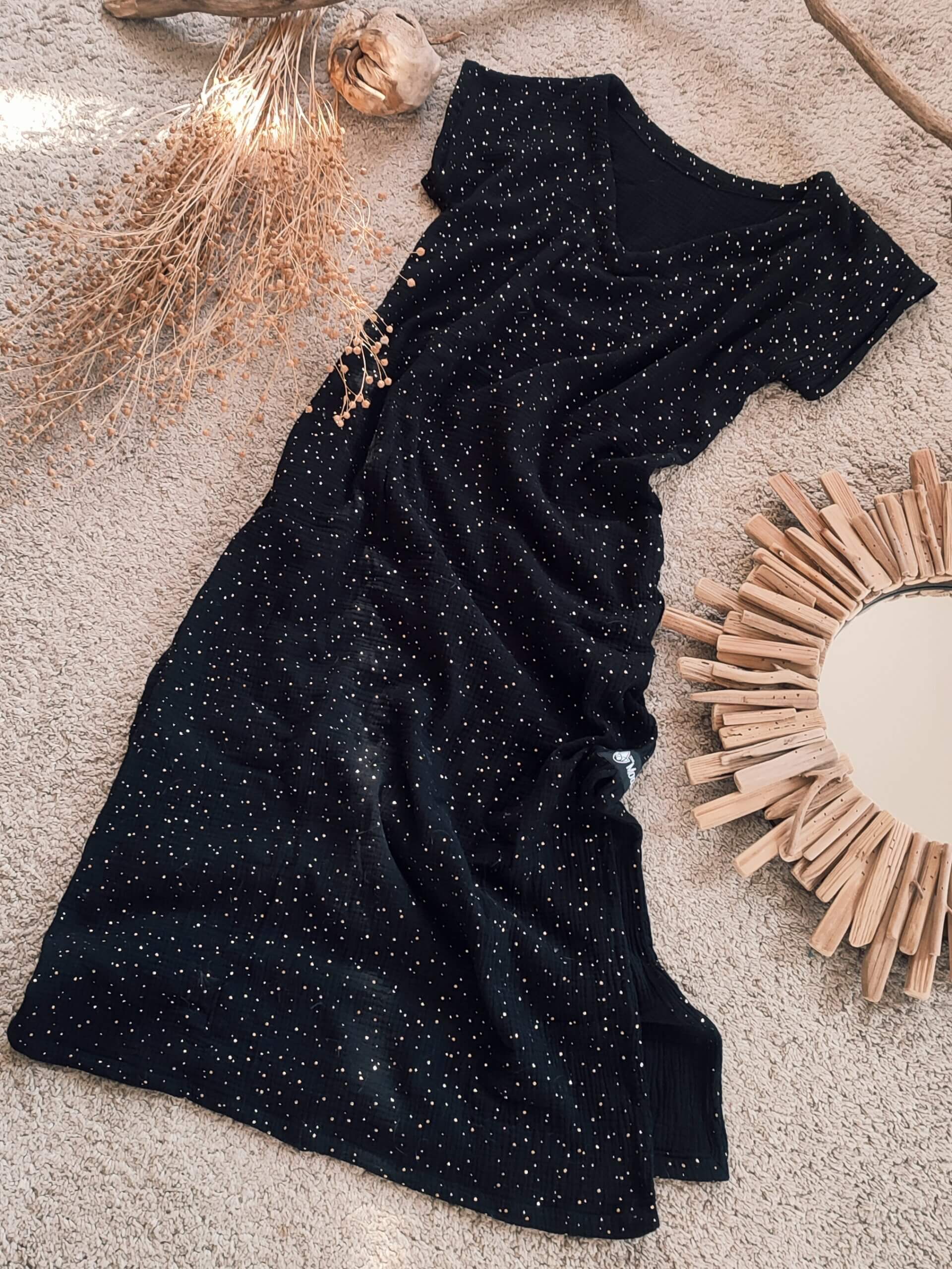 Šaty jak jasné noční nebe poseté hvězdami… lehce áčkové šaty v délce nad kotníky, s véčkovým nebo lodičkovým které lze nosit oboustranně, bočním rozparkem a kapsami Vás rozhodně nechají volně dýchat.