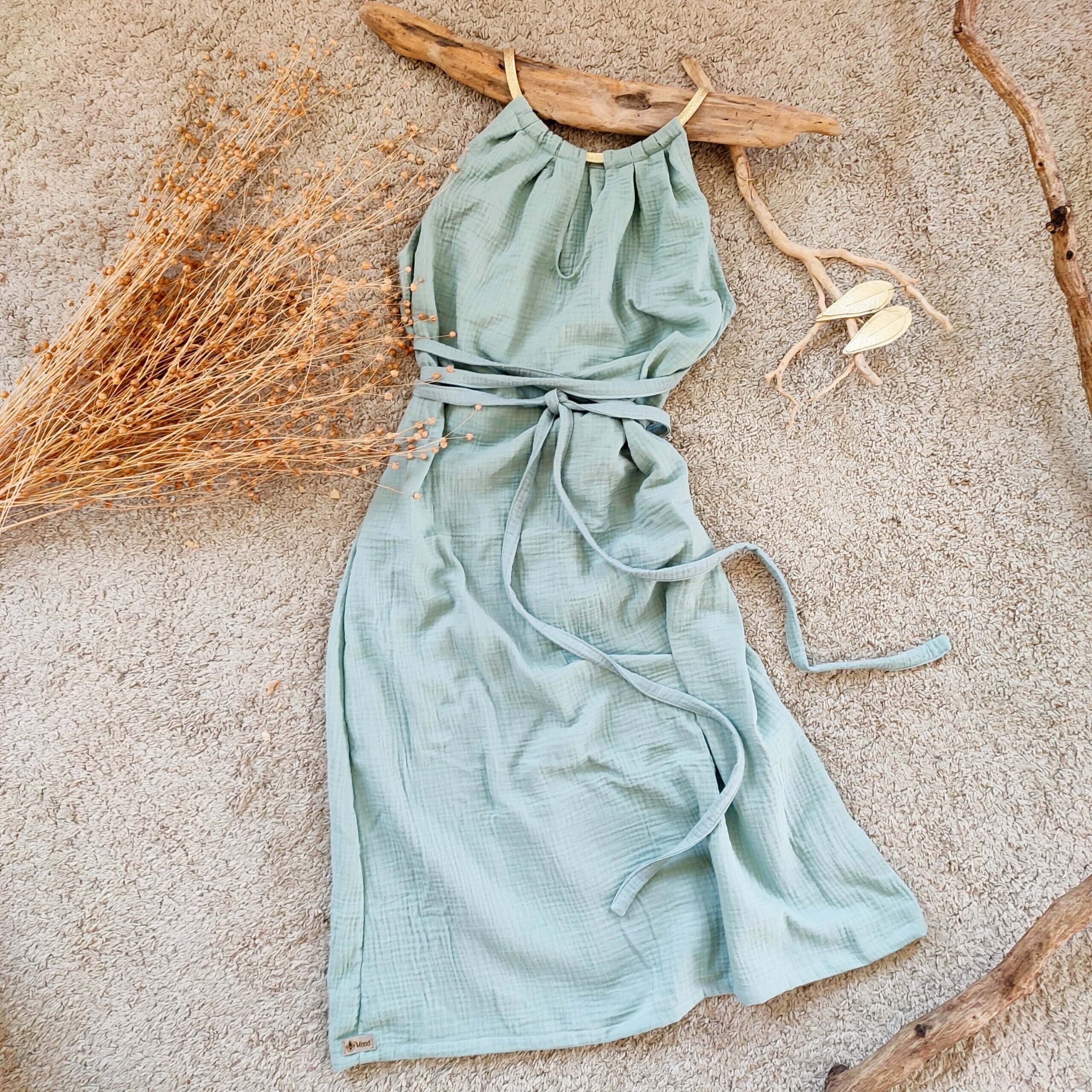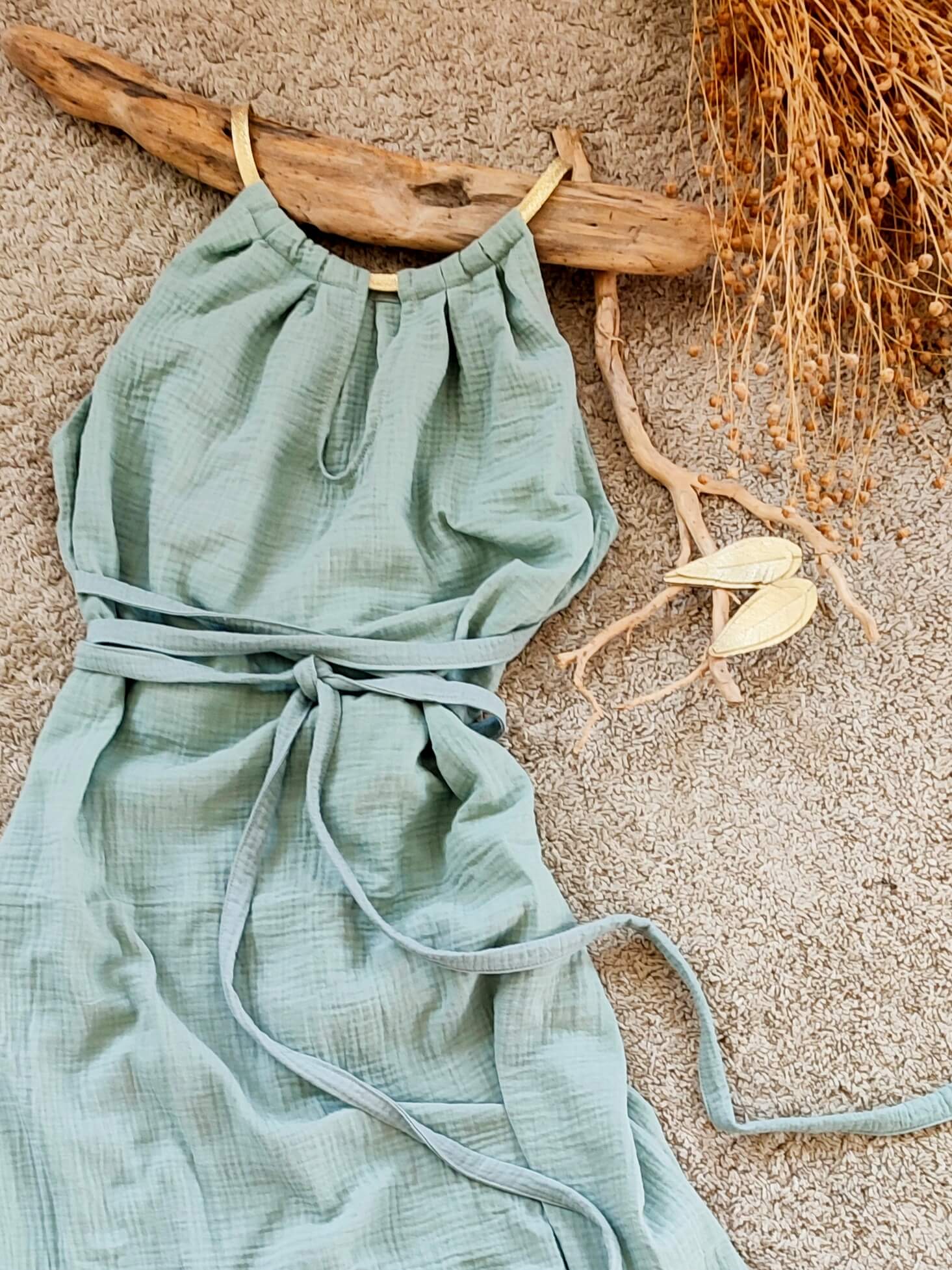 Mušelínové šaty z bio bavlny ve svěžím, světlém modrozeleném  odstínu jsou zosobněním lehkosti, vzdušnosti a léta.