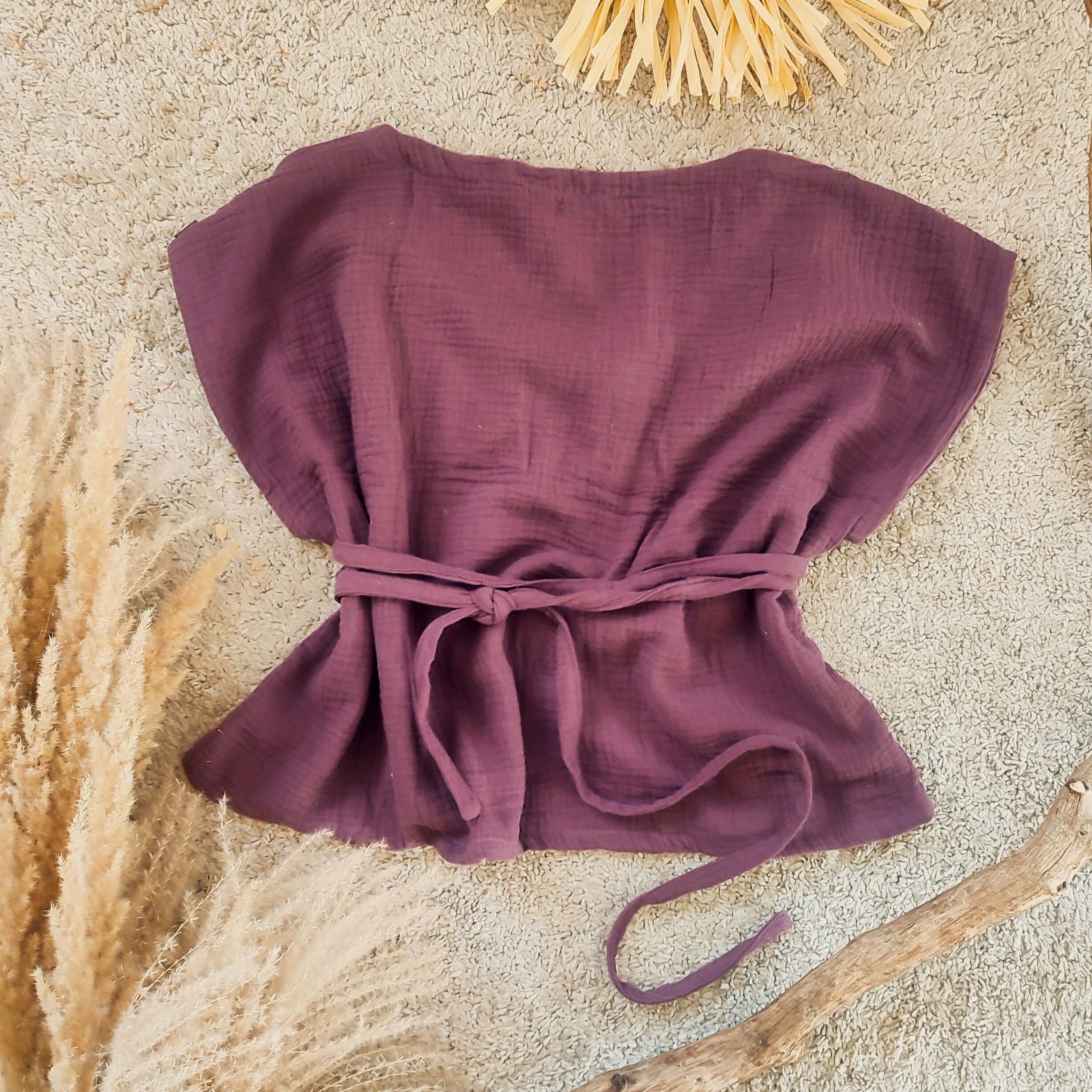 Mušelínový volný top ve fialovém odstínu má integrované dlouhé vázačky, jejímž dvojitým skřížením pod prsy docílíte krásného vytvarovaní.