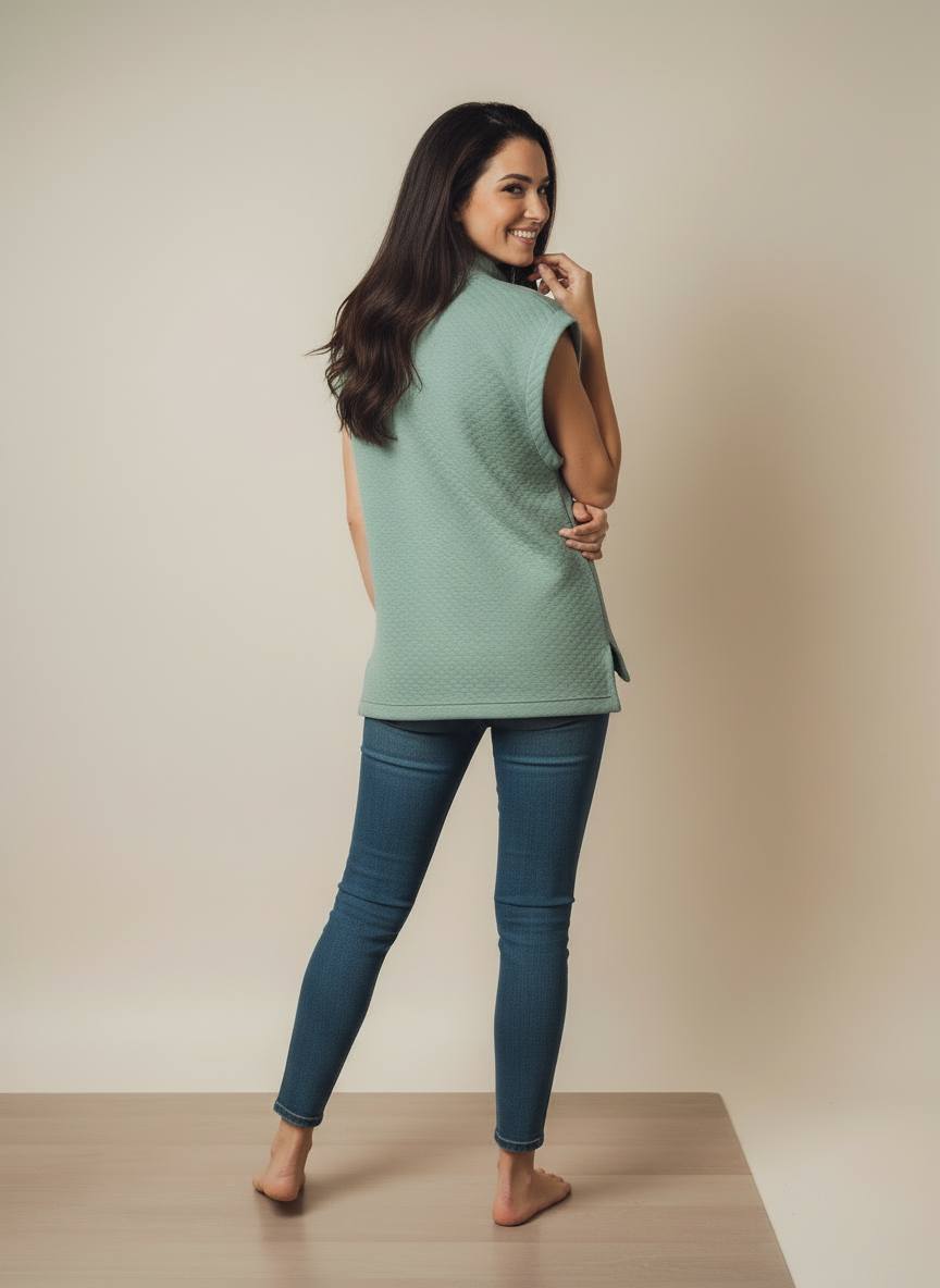 Skvěle kombinovatelná vesta z vysokogramážního bavlněného proševu s lodičkovým výstřihem a nízkým stojáčkem je skvělým kouskem který elegantně leccos schová. Můžeš ji obléct jak rovnou na tělo, tak jako druhou vrstvu v zimě pro zahřátí.
